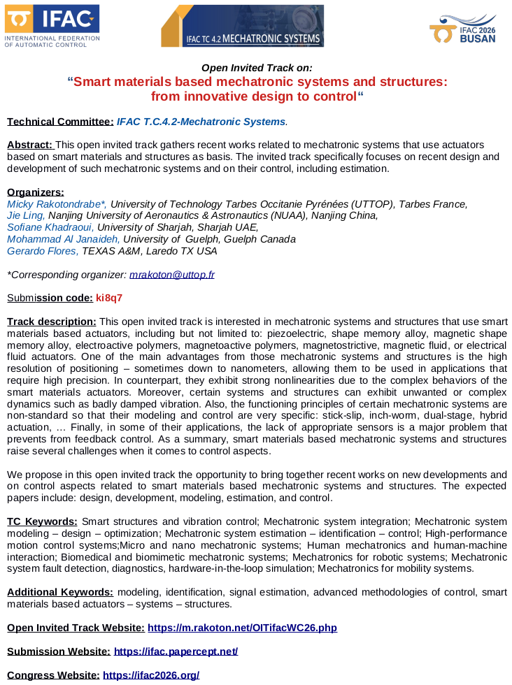 IFAC WC 2026 (ttps://ifac2026.org/): open invited track on "Smart materials based mechatronic systems and structures: from innovative design to control"